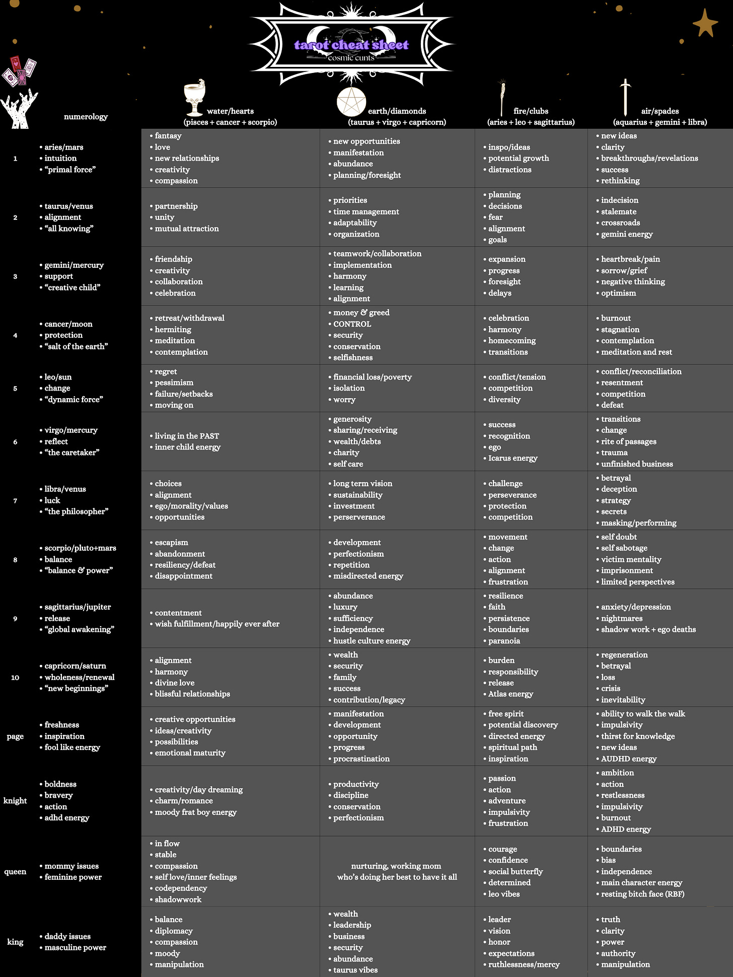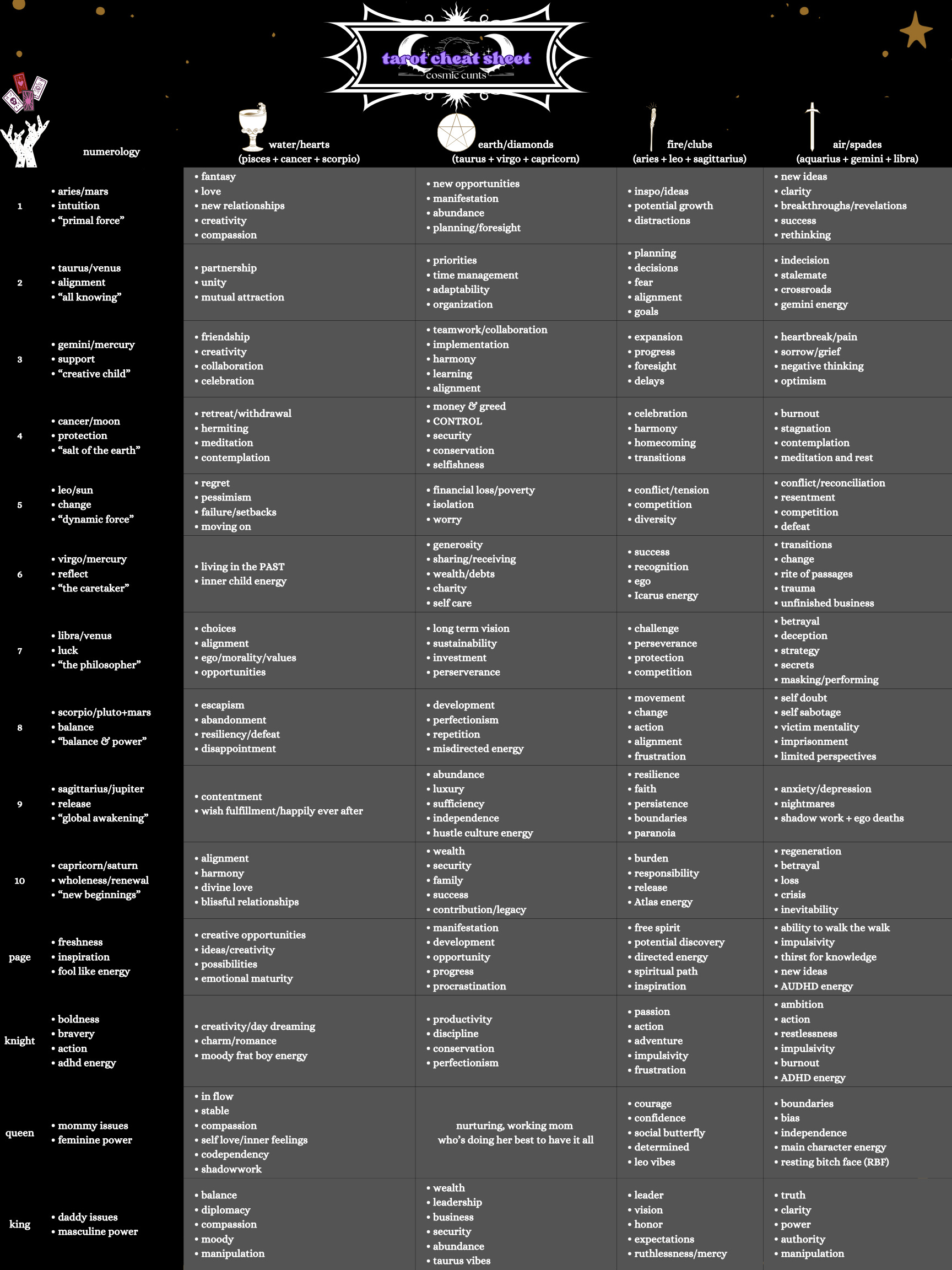 by sharing this cheat sheet with the collective, we here at The Cosmic Cunts Podcast hope to inspire the collective to pick up a tarot deck. while tarot and it’s many suits can seem intimidating at first, this cheat sheet provides you with a clear reference and guide, to help you memorize and understand the different energies the cards posses- without you having to constantly flip back and forth through your guidebook, (let’s avoid that frustration headache and adhd overwhelm if we can).